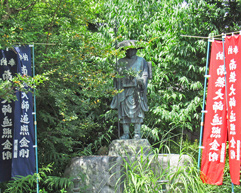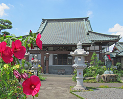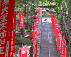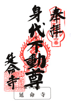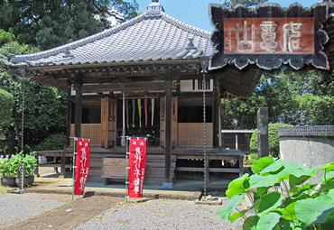 不動堂と "如意山"の扁額、身代り不動尊の低い幡が立つ |