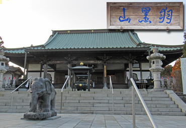 大聖寺と "羽黒山"の扁額、前に釈迦由来の象の石像 |