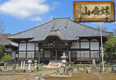 妙法寺と "秋 山喬 山"の扁額、前に石塔や庚申塔がある |