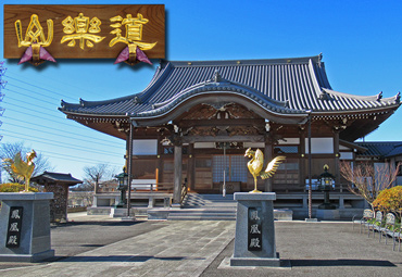 永光寺と "道楽山"の扁額、手前に奉納された鳳凰像が立つ |
